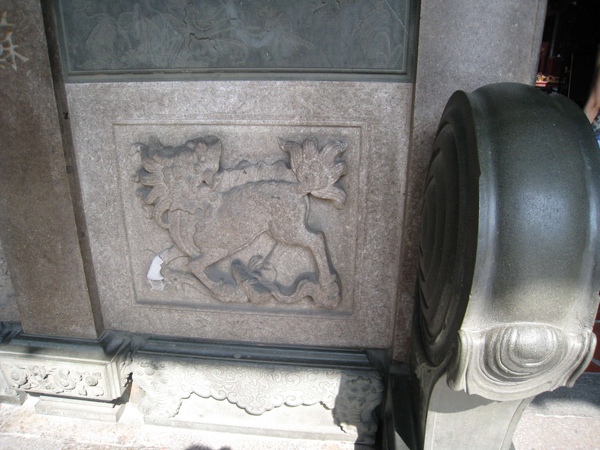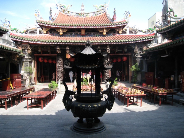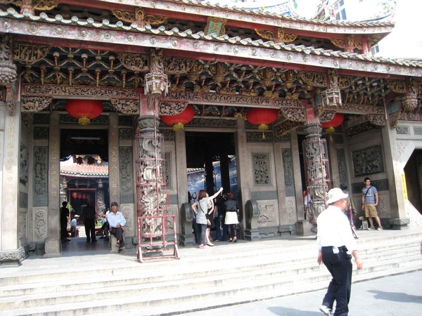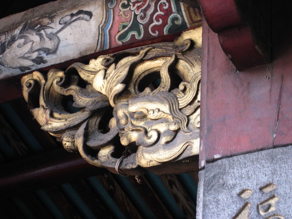 施聰欣滔滔不絕的解說道,最初擁有九十九道門的龍山寺,每處小地方都非常講究,從第一道正門開始,就相當有玄機。如第一座門的左右各三根柱子,二根是方的,一根是圓的,代表著「來自『四』面八方和『三』陽開泰」,相對襯的一方亦相同,故兩者加起來,六根柱子便形成了「六六大順」;再加上進門的另外六根柱子,就形成十二天干地支。